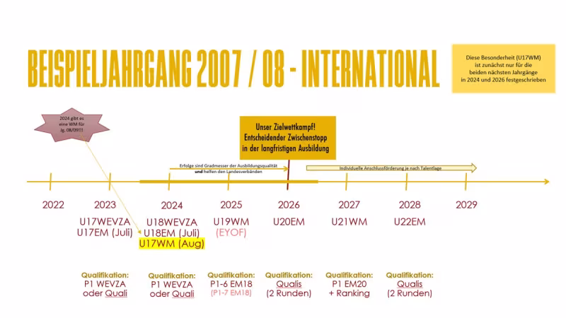 Zusätzlich gibt es nun auch Europameisterschaften für die U17-Kategorie (in den ungeraden Jahren) sowie eine U17-WM in den geraden Jahren. Dies ist insofern besonders, als die Qualifikation zur U17WM durch die U17EM im Jahr vorher ausgetragen wird und somit nur der jüngere Jahrgang dann auch spielberechtigt für die WM sein wird. Dieses Pilotprojekt ist vorerst auf die nächsten beiden Jahrgänge beschränkt.