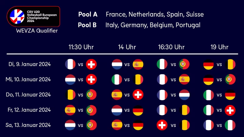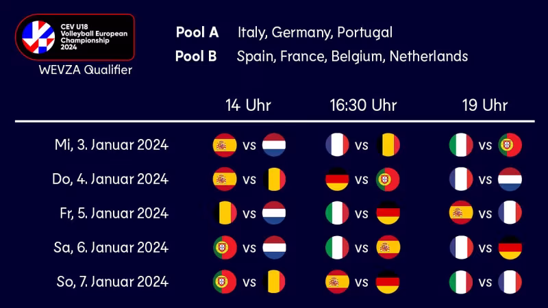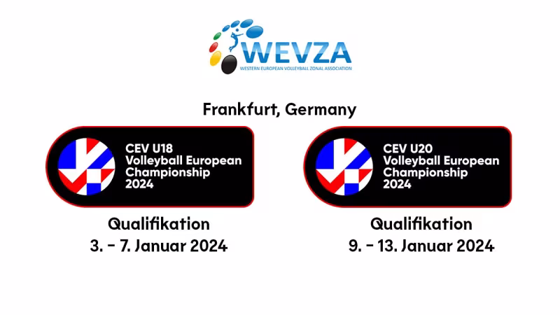 Im Januar 2024 begrüßen wir die männlichen Nachwuchsnationalteams der WEVZA Nationen in Frankfurt (Main) zur 1. Qualifikationsrunde für die U18- und U20-Europameisterschaft 2024. In der Wintersporthalle werden die ersten Plätze für die EM-Endrunde ausgespielt. Der Eintritt ist frei. Livestreams gibt es auf dem YouTube-Kanal des DVV.